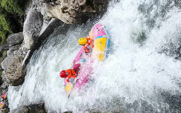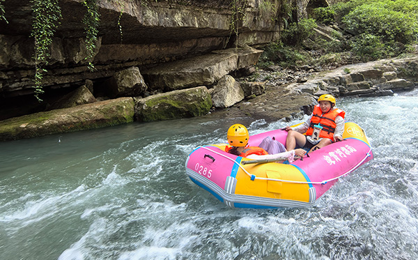 漂流分为上下两段,上半程勇士峡谷漂7.5千米,狂野刺激,河道险峻,大小跌水急滩多达50余处,自然落差180余米,约3小时的漂流,是舒缓压力,忘却烦恼的互动式游乐项目,体验与浪搏击的快感,带你决战巅峰;下半程风情休闲漂约5千米,漂流动静相宜,在缓流中荡漾,品味山水柔情的浪漫情调,约2小时的漂流,体验青山绿水的幽静,人与自然的和谐,是老少皆宜的"万人迷"漂流。