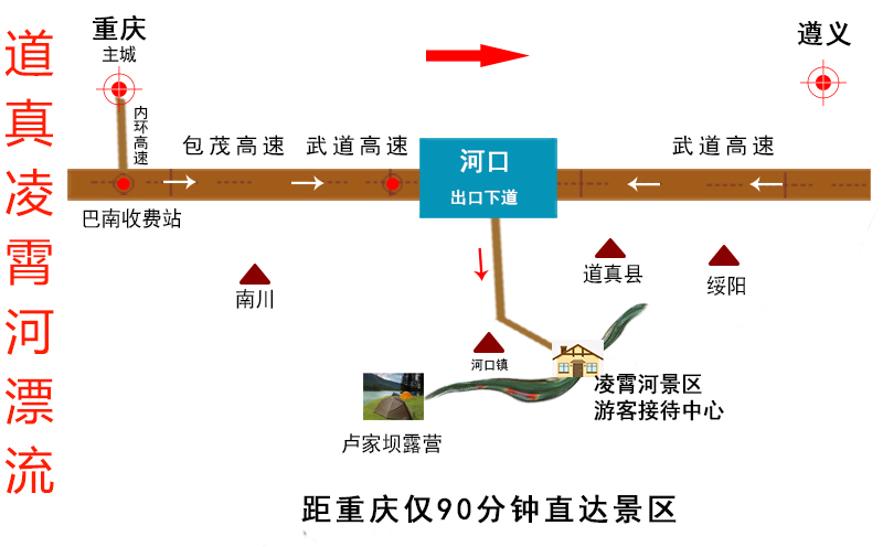 1、重庆—包茂高速—银百高速—道真北收费站—凌霄河景区
